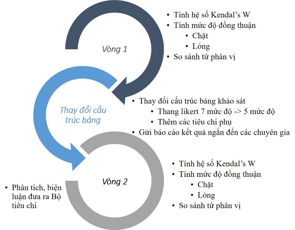 Hình 1. Quá trình thực hiện tính toán mức độ đồng thuận của chuyên gia theo kỹ thuật Delphi