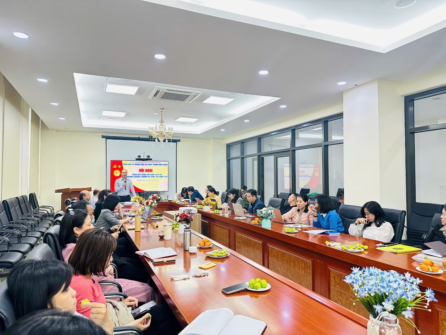 Tại Hội nghị, TS. Lê Văn Hùng – Phó Viện trưởng đã trình bày Báo cáo tổng kết công tác năm 2025 và phương hướng, nhiệm vụ công tác năm 2026. Báo cáo cho thấy, mặc dù năm 2025 là năm đầu tiên Viện hoạt động theo mô hình hợp nhất, song Viện đã nhanh chóng ổn định tổ chức, duy trì nhịp độ nghiên cứu và đạt được nhiều kết quả quan trọng. Trong năm, Viện đã triển khai hiệu quả các đề tài, nhiệm vụ khoa học các cấp, trong đó có đề tài cấp Nhà nước đạt loại Xuất sắc, nhiều đề tài cấp Bộ, nhiệm vụ điều tra kinh tế – xã hội và nhiệm vụ bảo vệ môi trường thực hiện đúng tiến độ. Công tác tổ chức hội thảo, tọa đàm khoa học tiếp tục là điểm sáng với các hội thảo quốc gia có kỷ yếu ISBN và các tọa đàm quốc tế góp phần mở rộng hợp tác học thuật, nâng cao uy tín khoa học của Viện.