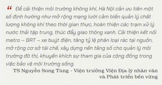 Để cải thiện môi trường không khí, Hà Nội cần ưu tiên một số định hướng như mở rộng mạng lưới cảm biến quản lý chất lượng không khí theo thời gian thực, hoàn thiện các trạm xử lý nước thải tập trung, thúc đẩy giao thông xanh. Cải thiện kết nối metro – BRT – xe buýt điện, tăng tỷ lệ phân loại rác tại nguồn, mở rộng cơ sở tái chế, xây dựng nền tảng số cho quản lý môi trường đô thị, khuyến khích sự tham gia của cộng đồng trong việc bảo vệ môi trường sống.