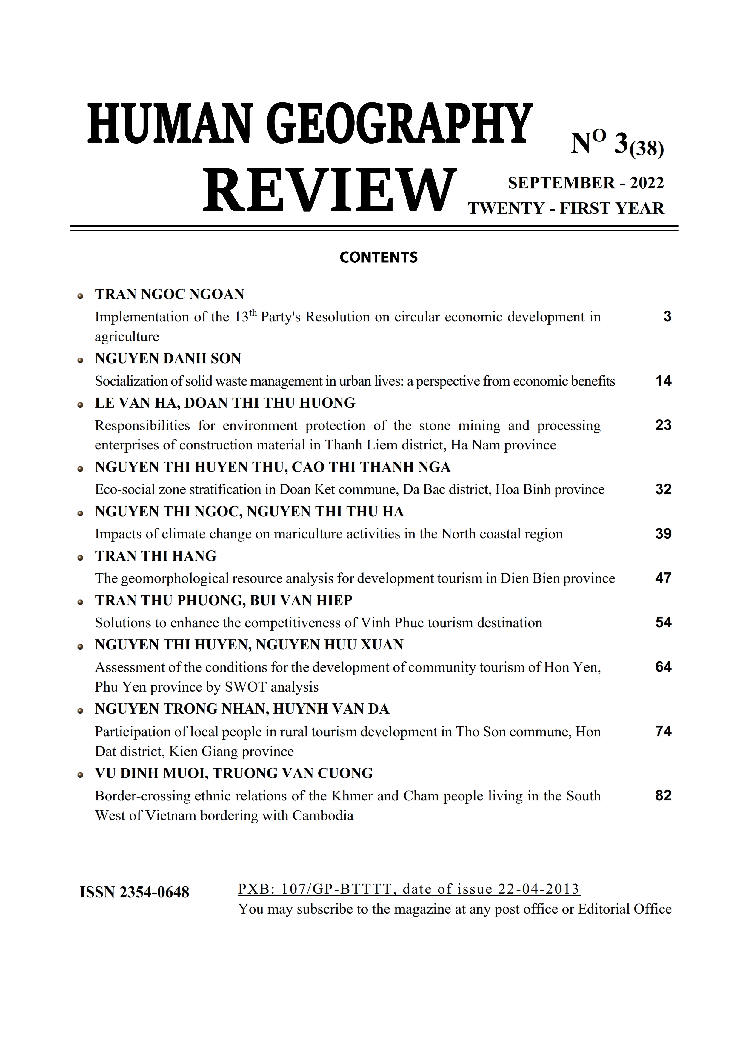 Abstract: The pursuit of social responsibility in manufacturing is an effective policy approach to minimize the negative impacts of businesses on the natural and social environment. From a geopolitical perspective and a qualitative approach, the study clarifies the current situation and identifies a number of issues in the implementation of social and environmental responsibility of enterprises exploiting and processing building materials in Thanh Liem district (Ha Nam province). The results show that environmental social responsibility in two enterprises selected for the case study has been pursued. At the same time, there is a significant improvement in the implementation of environmental social responsibility in other mining enterprises in stone processing for construction materials compared to that of 5 years ago. The article suggests that, in order for construction materials stone processing enterprises to implement social and environmental responsibilities, it is necessary to link them to the specific geographical, economic, and political context of Thanh Liem district, close supervision by the State, the local people, and other stakeholders.